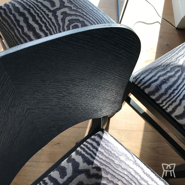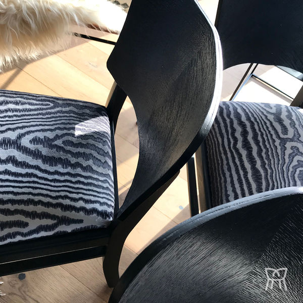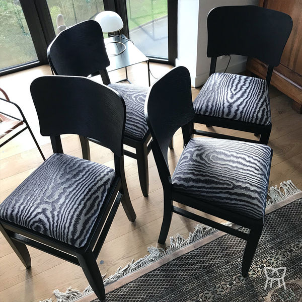 Restauration complète pour cette série de quatre chaises bistrot 50's, zones confort, traitement boiseries, peinture Ressources, tissu Casadeco.