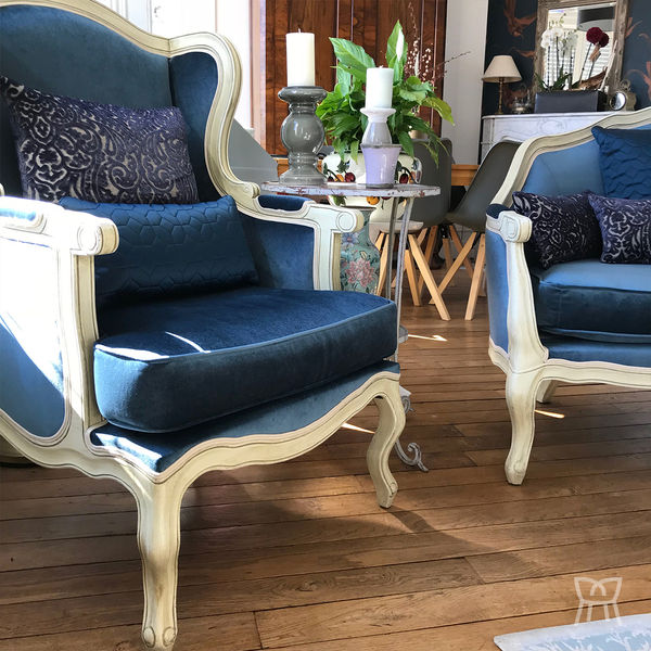 Rénovation complète d'un salon Louis XV + confection des coussins. Trio tissus : velours uni, velours arabesques, tissu matelassé, finition double corde passementeries de l'île de France.