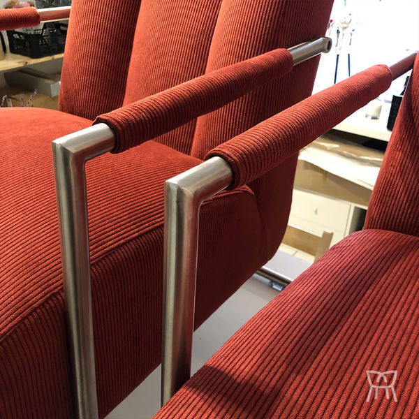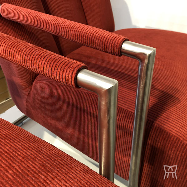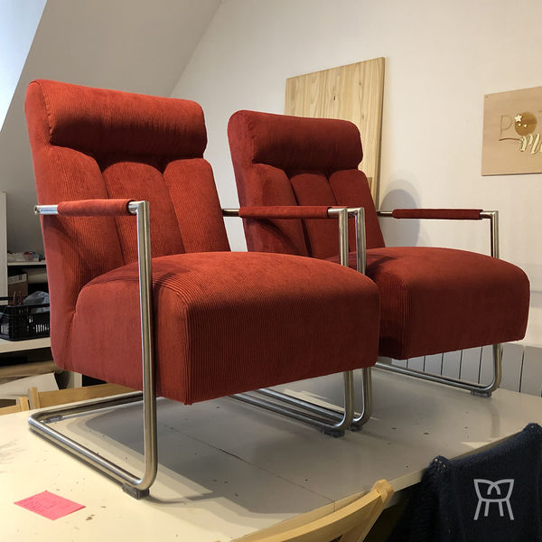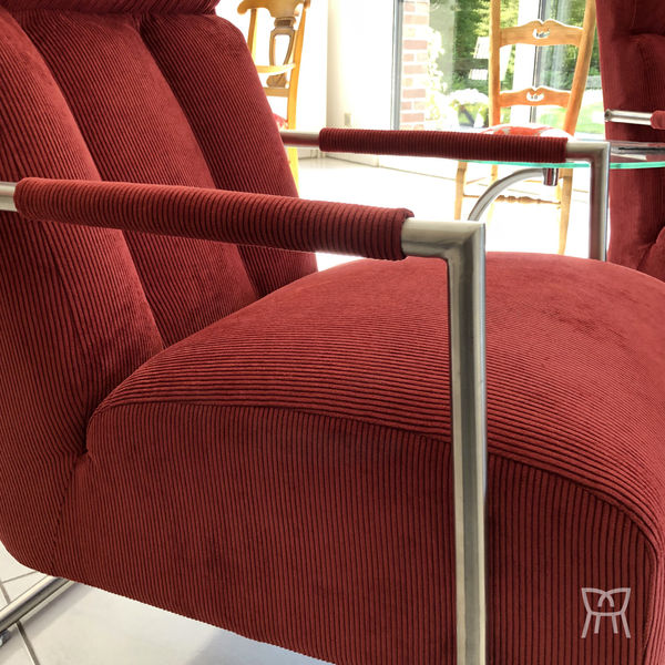 Rénovation complète pour cette cette paire de fauteuils modernes à châssis tubulaire métal. Velours côtelé rouge.