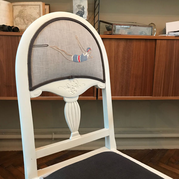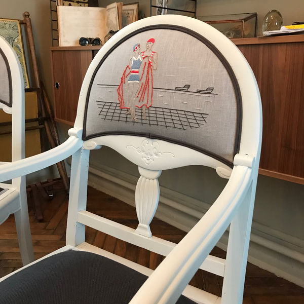 Restauration d'un ensemble 1930, chaises, fauteuil et banquette en partenariat avec Au Bon Détail.
